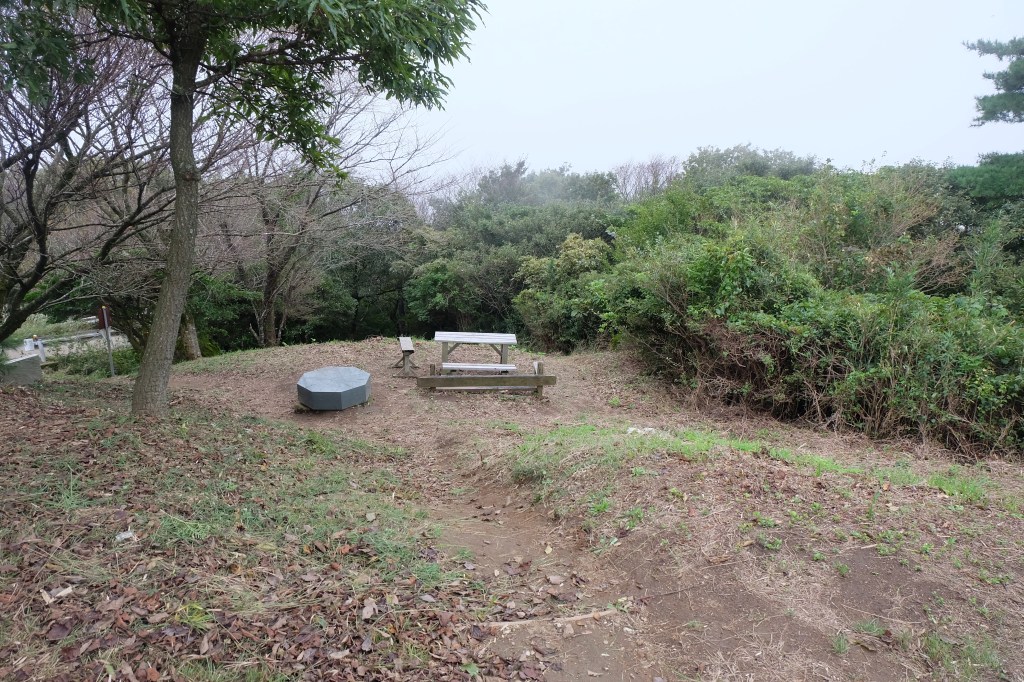 頂上には休憩用のテーブルとベンチが数多くあり、登山客が食事をしたり話したりしている。